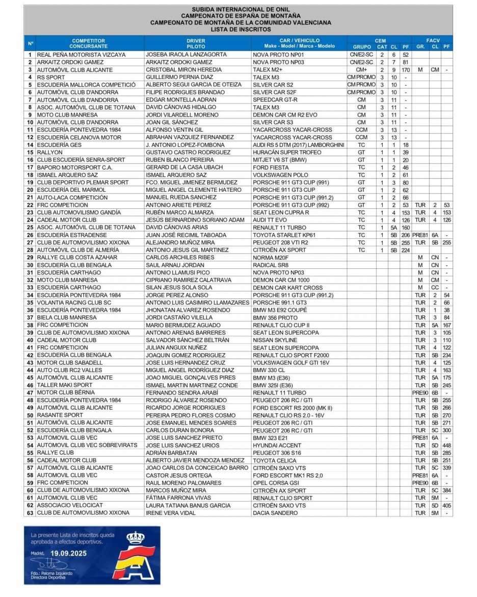 Con la lista definitiva de inscritos publicada, serán 62 pilotos los que tomarán la salida los días 26/27/28 de septiembre en la Subida Internacional de Onil, última prueba del Campeonato Nacional de Montaña AUTOhebdo Sport 2025.