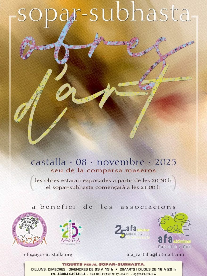 El sopar subhasta se celebrará en la comparsa de Maseros de Castalla, el sábado 8 de noviembre de 2025, y promete ser una noche especial, cargada de arte, emoción y solidaridad.