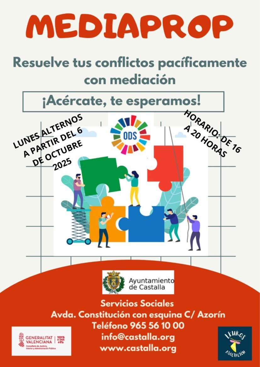 Mediaprop es un proyecto que viene a través de la Conselleria de Justicia de la Generalitat Valenciana, para los ayuntamientos de más de 7.000 habitantes. A Castalla, cada año se le concede una subvención, con la que se hacen cargo los costes de este servicio, el cual está licitado con la empresa Aletea Diálogo.