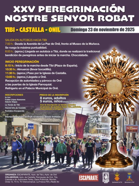 El próximo domingo 23 de noviembre de 2025 tendrá lugar la XXV Peregrinación a Nostre Senyor Robat, una cita ya tradicional que une a las localidades de Tibi, Castalla y Onil en una jornada de fe, convivencia y tradición compartida. El evento, organizado por Escaparate, junto a los ayuntamientos de Tibi y Onil, cuenta con la colaboración del Ayuntamiento de Castalla, las parroquias de las tres localidades y diversos medios y entidades comarcales. Programa de la jornada La salida en autobús hacia Tibi será a las 7:00 horas desde la Avenida […]
