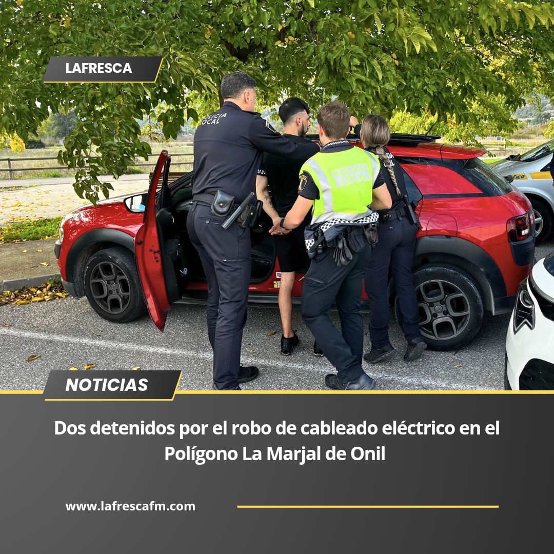La Policía Local de Onil detuvo el pasado 3 de noviembre a dos individuos acusados de sustraer cableado eléctrico en el Polígono Industrial La Marjal, tras ser sorprendidos mientras manipulaban arquetas de alumbrado público.