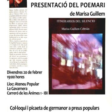 Hoy, viernes 20 de febrero, L'Ateneu Popular La Gavarnera de Ibi tendrá lugar la presentación del poemario Itinerarios del silencio, de la autora Marisa Guillem Cebrián. El acto, programado para las 19:00 horas, se plantea como un espacio donde la poesía y la reflexión social se entrelazan en torno a la salud mental, temática central de la obra. El libro, de marcado carácter íntimo, está inspirado en una vivencia personal […]