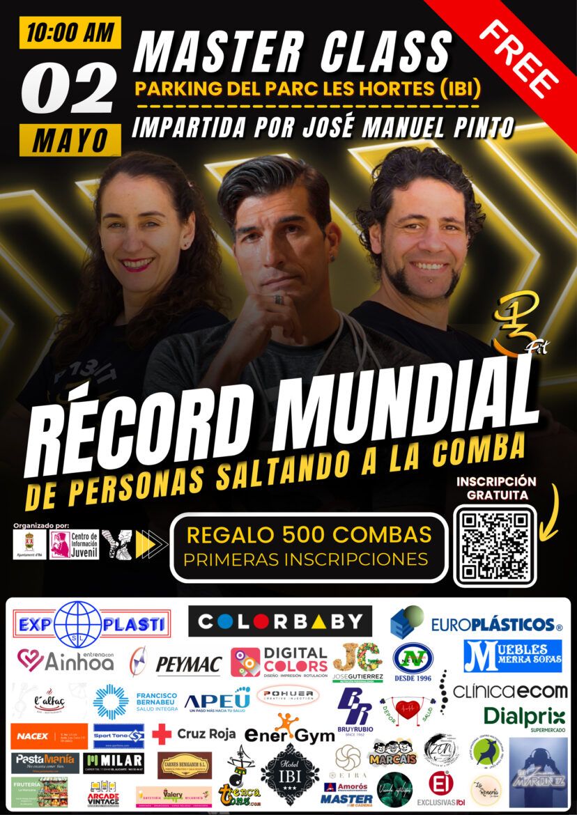 Las personas participantes podrán disfrutar de una masterclass de 55 minutos, conducida por el exfutbolista, productor y compositor musical, José Manuel Pinto, en la que se aprenderá nuevas técnicas y formas diferentes de entrenar, en un ambiente festivo y motivador, acompañado por monitores que guiarán a los participantes. Una gran oportunidad para que familias, amigos y vecinos de Ibi vivan una jornada de deporte y diversión compartida. Pero antes de la masterclass, se vivirá el reto histórico de intentar batir el récord mundial de 507 personas saltando a la cuerda al ritmo de la música de manera sincronizada con el método P13Fit.