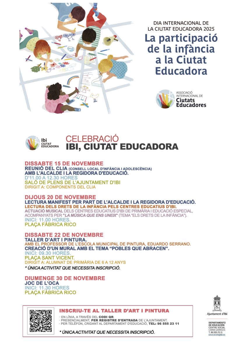 L’Ajuntament d’Ibi, a través de la Regidoria d’Educació, s’adhereix a la commemoració del Dia Internacional de la Ciutat Educadora 2025 amb una completa programació d’activitats que es desenvoluparà entre el 15 i el 30 de novembre. L’objectiu d’esta celebració és fomentar la participació, la inclusió i l’aprenentatge, posant en valor Ibi com una autèntica Ciutat Educadora, on l’educació transcendeix les aules.