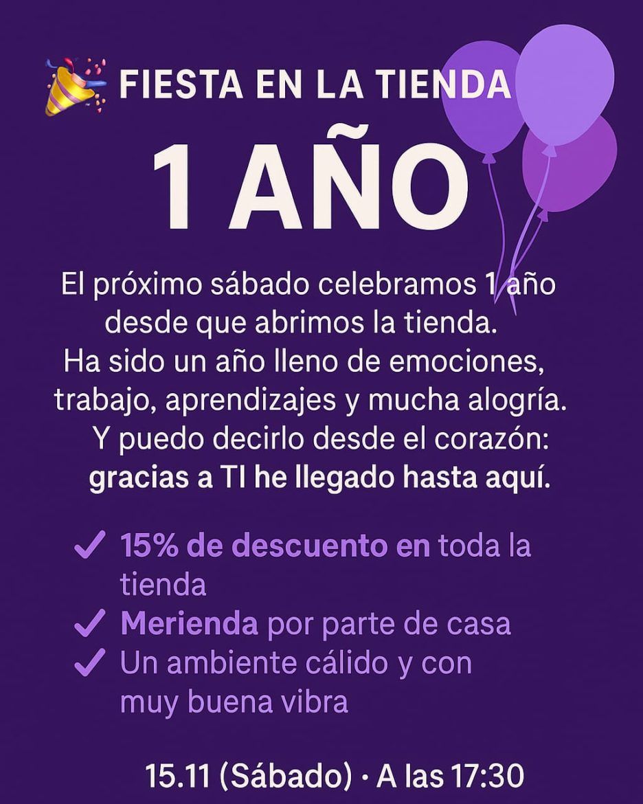 Para agradecer el apoyo recibido durante estos doce meses, la tienda ofrecerá un 15% de descuento en todos sus productos, además de una merienda gratuita y un ambiente “cálido y cercano” para quienes se acerquen a festejar este aniversario.