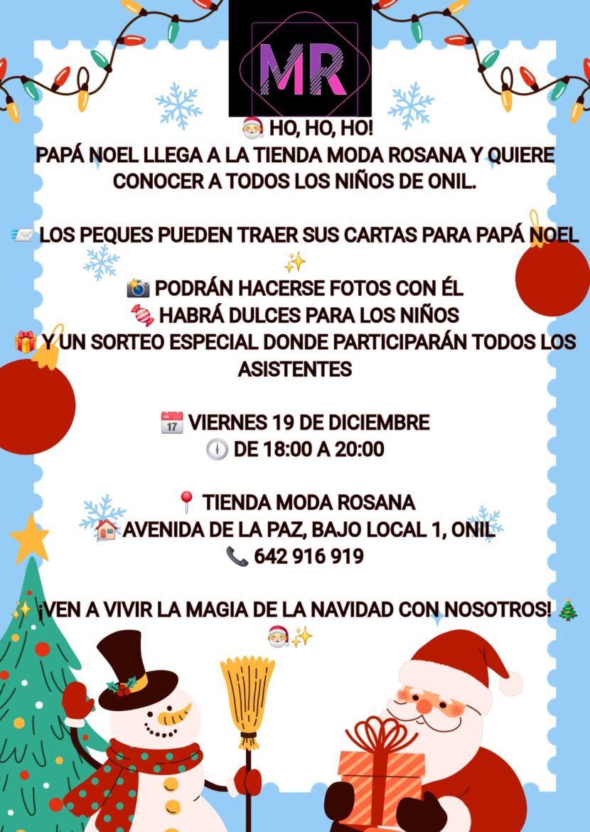 La Navidad llegará con un evento muy especial a Onil este viernes 19 de diciembre de 18:00 a 20:00 horas. Papá Noel hará una visita a la Tienda Moda Rosana, donde se encontrará con los niños y niñas de la localidad en una tarde pensada para disfrutar en familia.