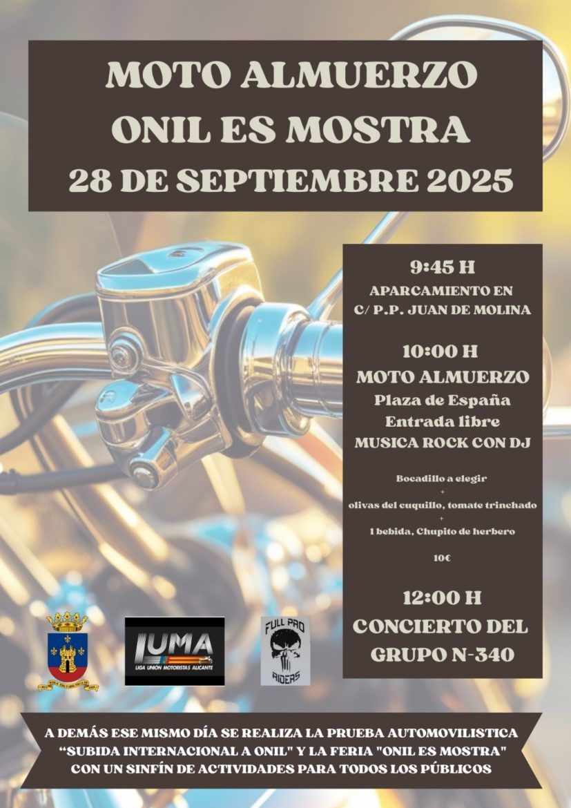 El próximo domingo 28 de septiembre de 2025, la localidad de Onil acogerá uno de los encuentros moteros más esperados del año en el marco de la feria “Onil es Mostra”. Se trata del Moto Almuerzo, un evento que reunirá a aficionados a las dos ruedas y al motor en general, con música en directo, gastronomía típica y un ambiente festivo pensado para todos los públicos.