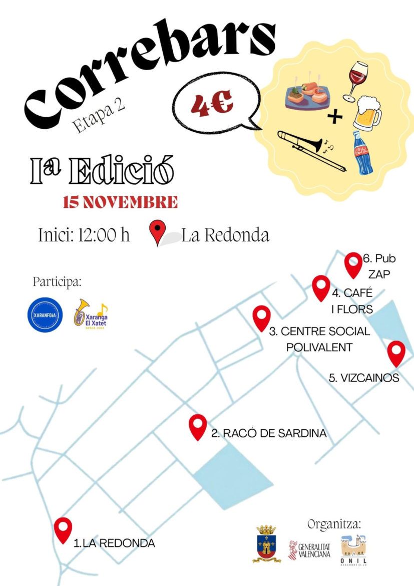 Onil acogerá el próximo 15 de noviembre la segunda etapa del Correbars, una iniciativa gastronómica y cultural que nació el pasado mes con una gran acogida por parte de vecinos y visitantes. El evento propone un recorrido por distintos establecimientos hosteleros del municipio, acompañado de música en directo y ambiente festivo en las calles.
