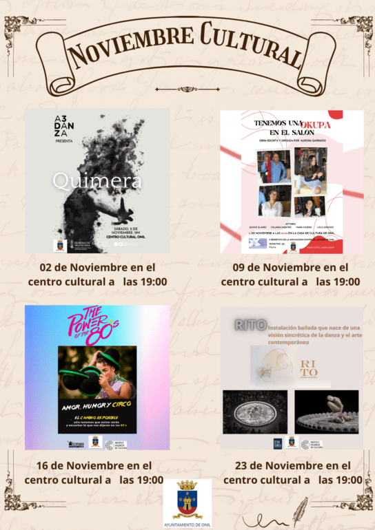 El municipio de Onil presenta un mes cultural vibrante durante todo el mes de noviembre, con una programación diversa que atraerá a todos los amantes del arte y la cultura. Las actividades tendrán lugar en el Centro Cultural de Onil a las 19:00 horas cada sábado del mes, ofreciendo una amplia variedad de espectáculos de danza, teatro y circo moderno. Programa de actividades: 2 de noviembre: La compañía A3 Danza presenta "Quimera", una obra que explora la lucha del ser […]